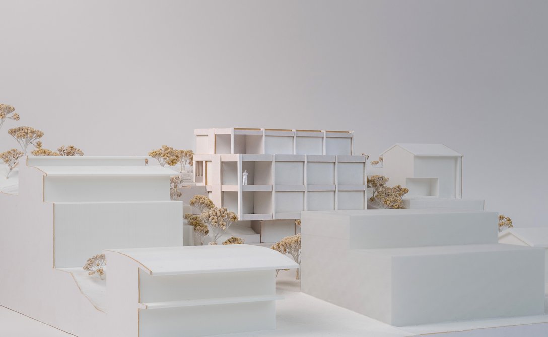Am Waldrand gelegen, geniesst das Grundstück eine privilegierte Aussicht über die Dächer der Aarauer Altstadt bis in die Alpen. Die Voraussetzungen für den Bau an steiler Hanglage waren herausfordernd. Als Alternative zu klassischen Terrassenhausbebauungen sucht das Dreifamilienhaus den minimalen Eingriff in Natur und Topographie.