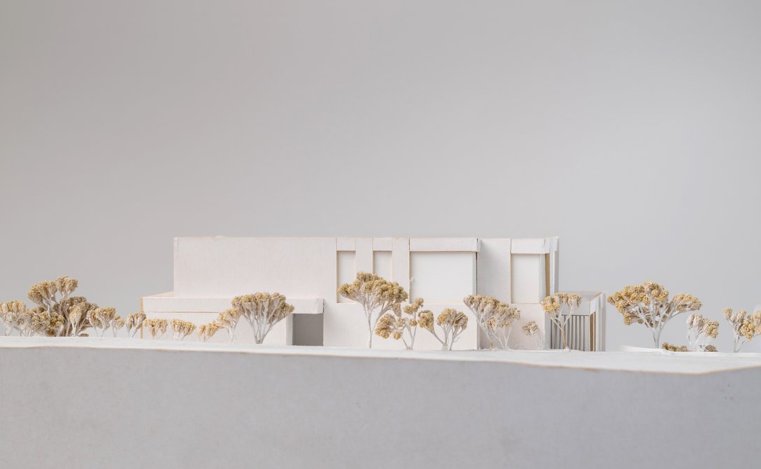 Zwei am Hang verschränkte Holzkörper scheinen leicht über dem zurückversetzten Sockel zu schweben. Das Haus zeigt sich schlicht und soll einfach gehalten werden. So kann sich die Ausdruckskraft und Schönheit der tragenden Holzrahmenkonstruktion, deren Rhythmus durch die transparente Gestaltung spürbar ist, vollends entfalten.