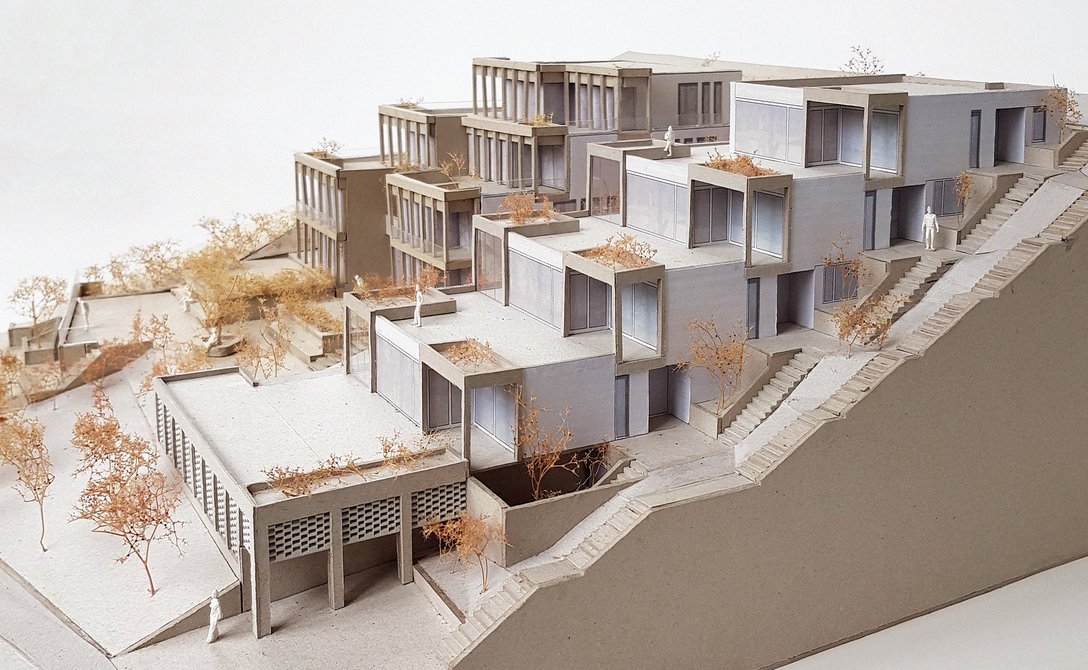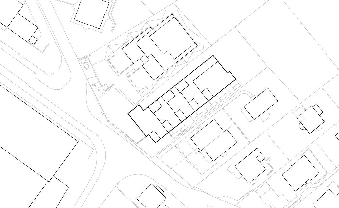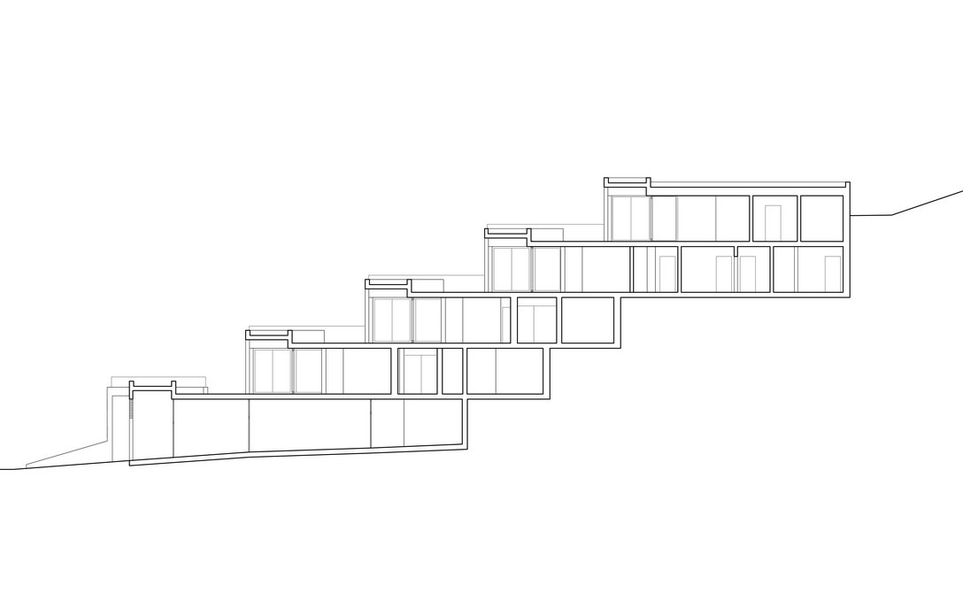 Als Ergänzung zum nebenan fertiggestellten Mehrfamilienhaus wurde ein Terrassenhaus mit vier Wohneinheiten entworfen. In fünf regelmässigen Abstufungen ist die Überbauung stärker auf die Topografie ausgerichtet und rückt weiter bis zum Strassenraum vor, was den zuvor geschaffenen Platzraum seitlich fasst. Die unterste Terrasseneinheit mit perforierten Wänden aus Klinkersteinen nimmt die Eingangshalle und die über die angrenzende Überbauung erschlossene Parkierung auf.