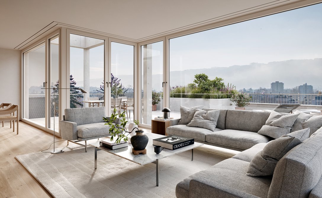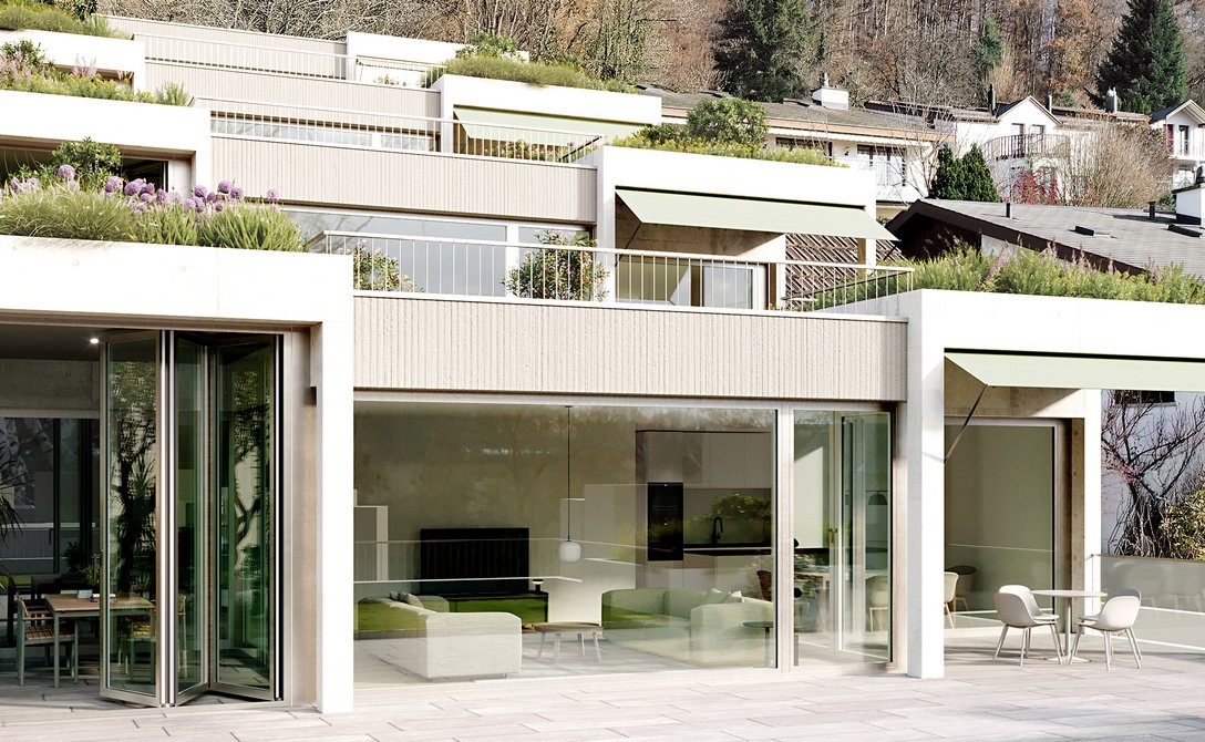 Überhohe Wintergärten und in Sichtbeton gerahmte Sitzplätze treten in Dialog mit der Fassade der benachbarten Überbauung und halten den Ausdruck des neuen Terrassenhauses doch eigenständig.